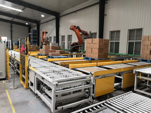 将产品通过进料输送带输送进料,机器人及夹具到产品上方,抓取产品后移动到栈板位,按事先输入的码垛形式进行产品码放。