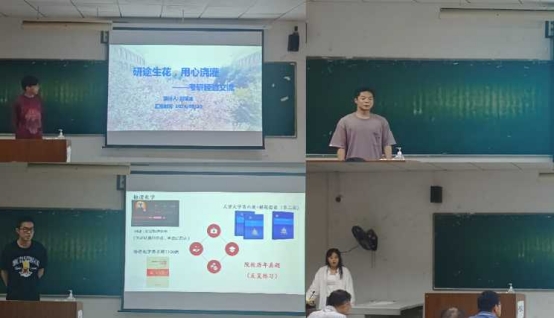 刘恒炫、邓明浩、吴佳珊、杨迪四人依次分享了考研经验:刘恒炫鼓励大家结合自身实际,辨清方向,专注学业目标,合理规划考研计划;邓明浩发言时强调要“行动不止,挑战当头”,把握现在,成就未来;吴佳珊表示选择大于努力,适合自己的才是最好的;杨迪鼓励同学们敢于有梦、勇于追梦、勤于圆梦。现场问答环节,低年级学生就自己关注问题积极提问,高年级学生逐一进行了耐心细致解答。