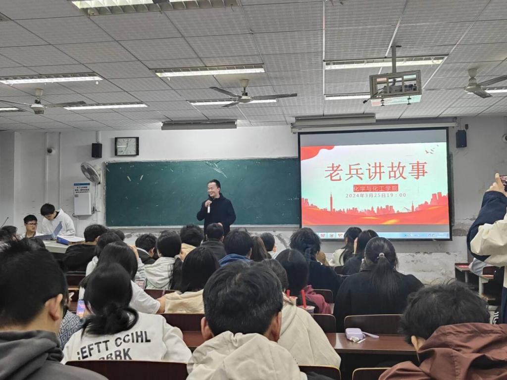 “部队像是一个大熔炉,进来一身铁,出去一身钢,只要进了部队就不怕你不成钢”。3月25日晚,化学与化工学院开展“听老兵讲故事,忆峥嵘岁月,扬爱国精神”为主题的老兵讲故事活动,此次活动我们邀请到化工学院四位退伍大学生士兵讲述军旅生活。化工学院党总支副书记闵建华、辅导员刘霞、苏家兴、学生代表参加了此次活动。