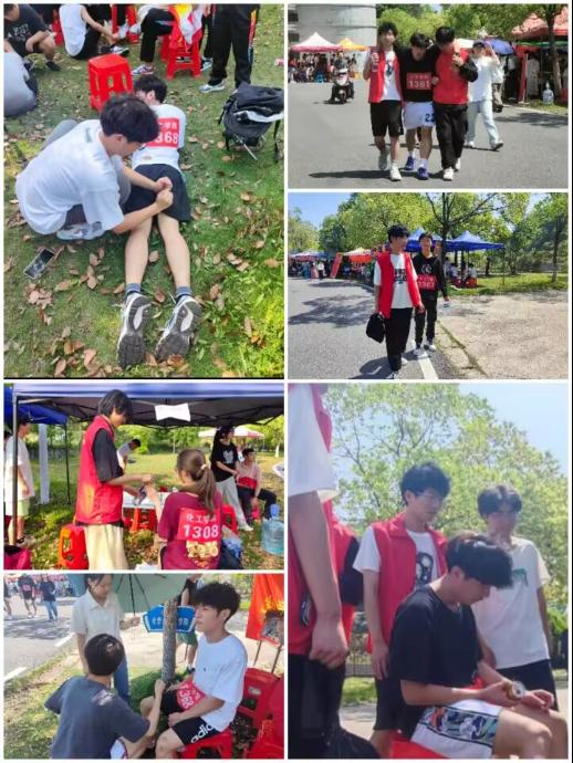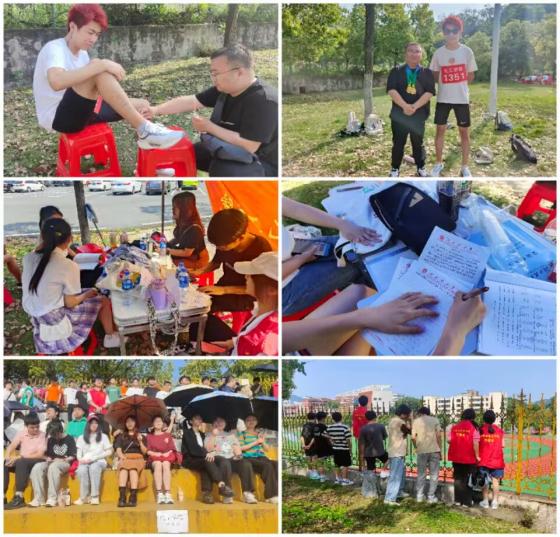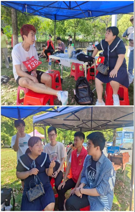 运动会中,化工学院学生志愿服务团队为运动员做赛事引导和后勤保障工作,志愿者们“一对一”跟赛,保障运动员饮水,赛场上,志愿者时刻关注运动员的状况,同时保证他们的安全。赛后为运动员放松肌肉。