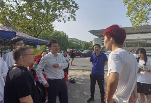 运动会期间,李社教校长亲临化工学院值班点慰问运动员和志愿者,他肯定了志愿者们的辛苦付出,并对打破学校三级跳远记录的姚远同学表示了祝贺。
