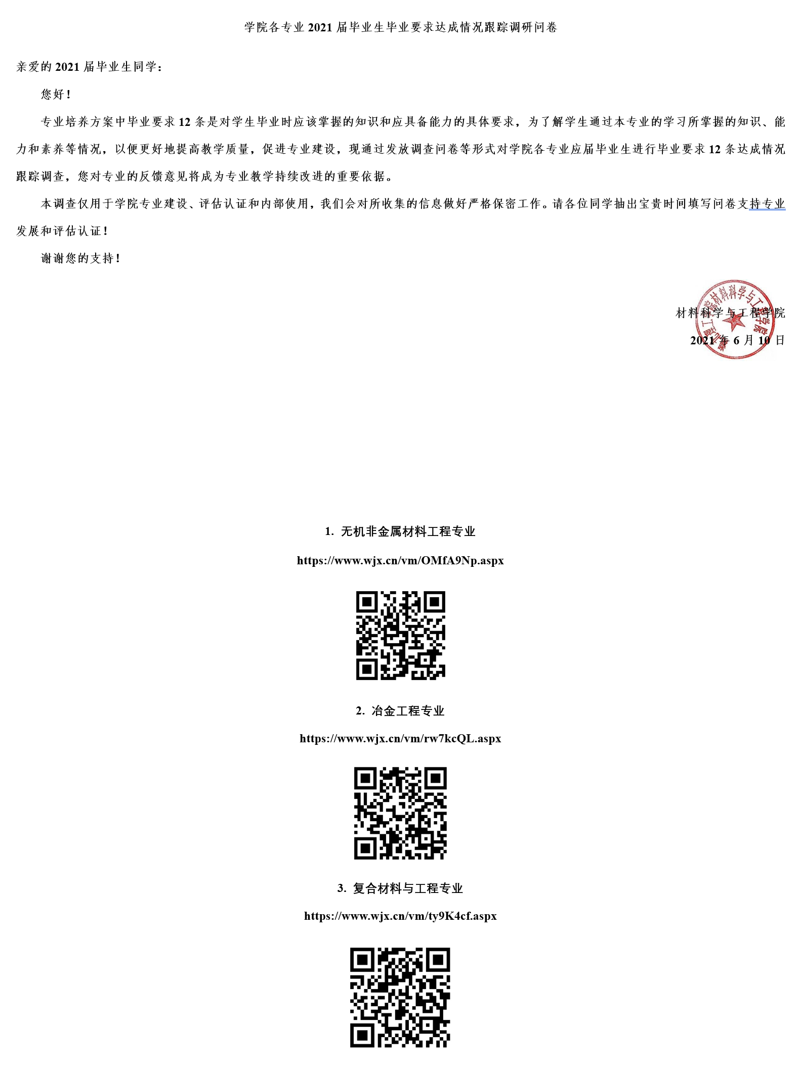 材料学院各专业2021届毕业生毕业要求达成情况跟踪调研问卷