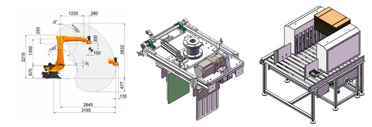 顶升抓取机构带有置中、叠包功能,可配合前叠包平衡码垛效率;专业设计的纸板夹具带有钩,可夹取放置一层或两层纸箱防掉落;机器人采用四轴式Kawasaki机械手臂兼顾性能与成本,将纸箱按自定义的垛型自动码放到托盘上。